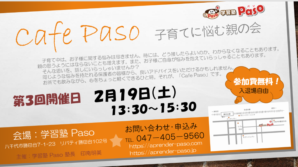 八千代市勝田台にある学習塾Pasoで、親の会「第3回 Cafe Paso」を開催します!